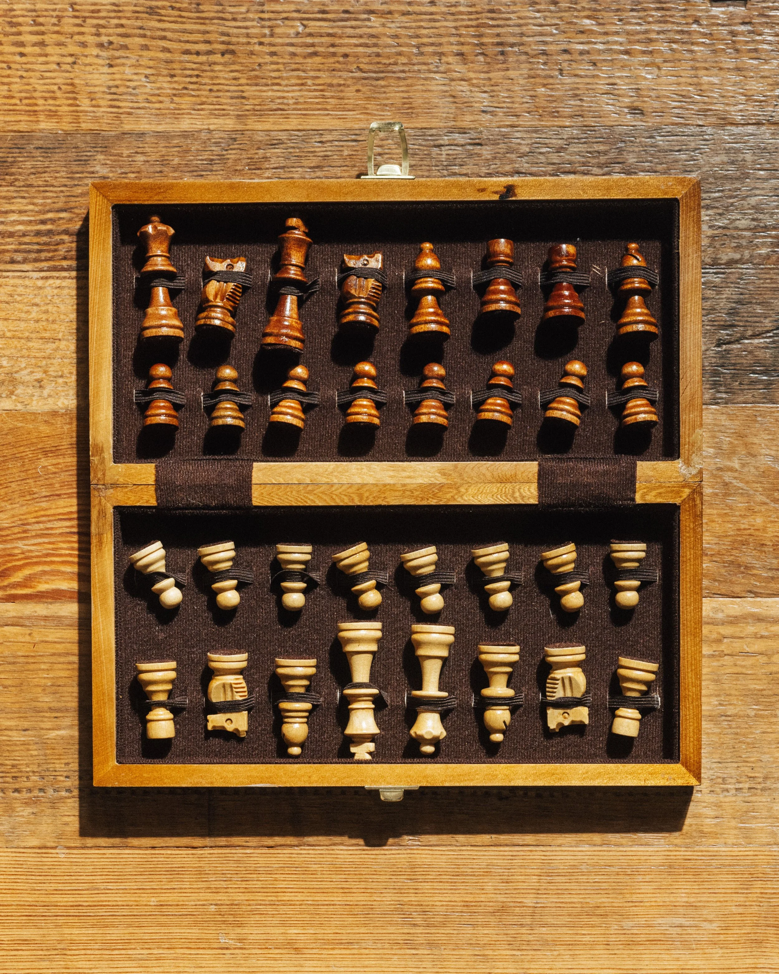 This portable wooden set features an inlaid checkered board that opens to reveal a complete set of carved chess pieces in contrasting light and dark wood. Each piece rests securely within a fitted, felt-lined interior. A brass latch closes the box for travel or safekeeping.